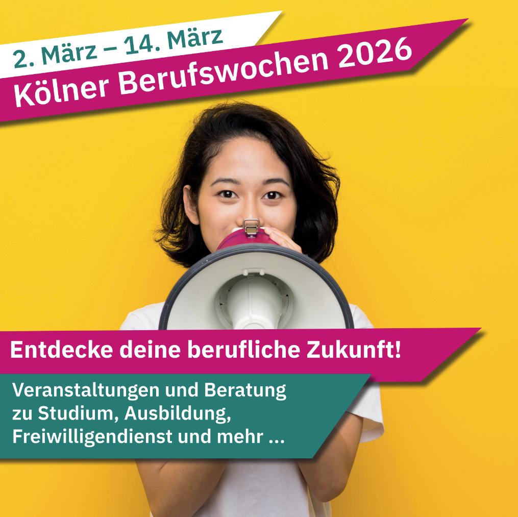 Unter diesem Motto bieten die Kölner Berufswochen vom 02. bis zum 14. März 2026 wieder ein ganz besonderes und vielfältiges Angebot an Veranstaltungen, Workshops und Beratungsmöglichkeiten zur Beruflichen Orientierung!