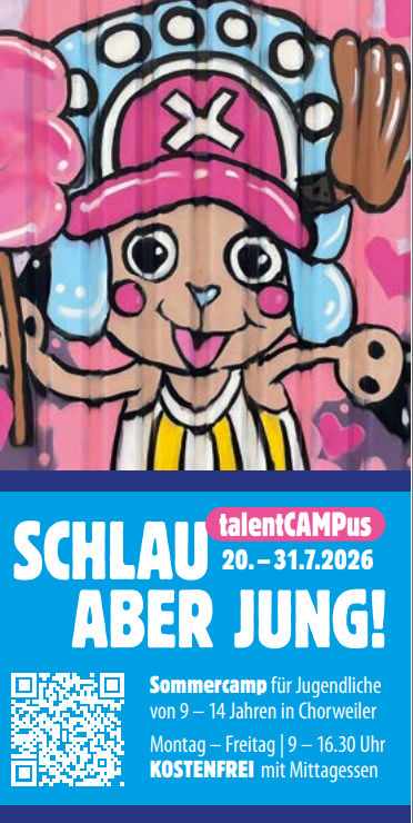 Entdecke Dich und Deine Fähigkeiten im talentCAMPus in den Sommerferien. Zwei Wochen – immer von Montag bis Freitag – gibt es für dich im Sommercamp viele verschiedene Workshops. Suche 2 Pakete aus.